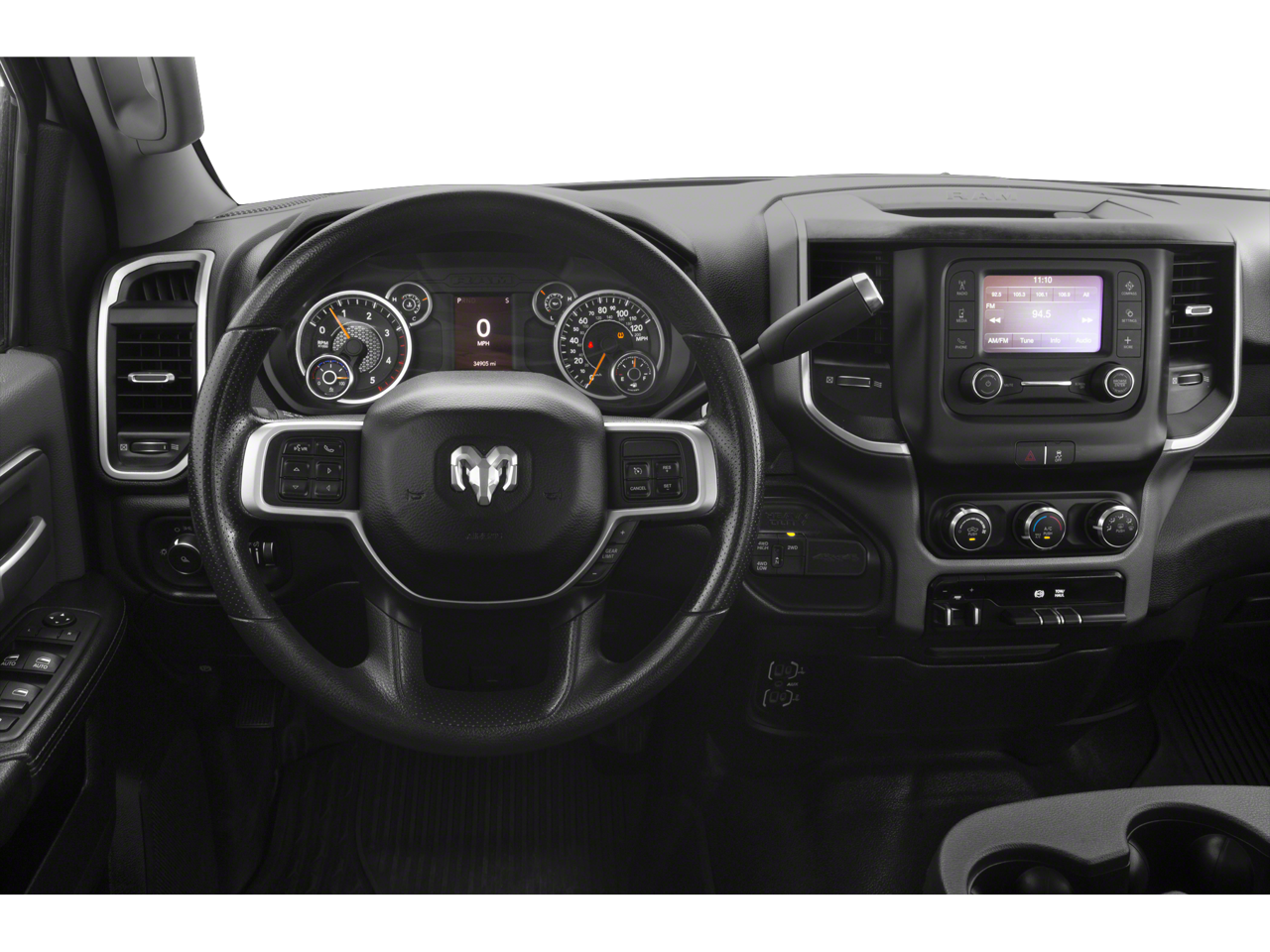 ENGINE: 6.7L I6 CUMMINS TURBO DIESEL Selective Catalytic Reduction (Urea), Dual 730 Amp Maintenance Free Batteries, Cummins Turbo Diesel Badge, Heavy Duty Engine Cooling, Tow Hooks, Diesel Exhaust Brake, Supplemental Heater, Front Bumper Sight Shields, Capless Fuel Fill w/o Discriminator, LEVEL 1 EQUIPMENT GROUP Radio: Uconnect 4 w/8.4 Display, Google Android Auto®, SiriusXM Satellite Radio, Integrated Center Stack Radio, 8.4 Touchscreen Display, Apple CarPlay®, Locking Lower Glove Box, Rear View Auto Dim Mirror, Power Adjustable Pedals, Leather Wrapped Steering Wheel, Rear Dome w/On/Off Switch Lamp, Front Fog Lamps, Power Adjust/Fold & Heated Black Tow Mirrors, Steering Wheel Mounted Audio Controls, Dual Glove Boxes, Glove Box Lamp, Footwell Courtesy Lamp, Universal Garage Door Opener, Cluster 3.5 TFT Color Display, Power Folding Mirrors, Foam Bottle Insert (Door Trim Panel), Wheels: 18 x 8.0 Polished Aluminum, 2nd Row In Floor Storage Bins, Sun Visors w/Illuminated Vanity Mirrors, Big Horn IP Badge, BLACK, PREMIUM CLOTH 40/20/40 BENCH SEAT Rear 60/40 Folding Seat, Front Armrest w/Cupholders, Front Center Seat Cushion Storage, Manual Adjust 4-Way Front Passenger Seat, Power Adjust 8-Way Driver Seat, Folding Flat Load Floor Storage, Front Seat Back Map Pockets, Power 2-Way Driver Lumbar Adjust, 9 ALPINE SPEAKERS W/SUBWOOFER, ANTI-SPIN DIFFERENTIAL REAR AXLE, PARKSENSE FRONT/REAR PARK ASSIST SYSTEM, REMOTE START SYSTEM, TRANSMISSION: 6-SPEED AUTOMATIC (68RFE) Chrome Accent Shift Control.